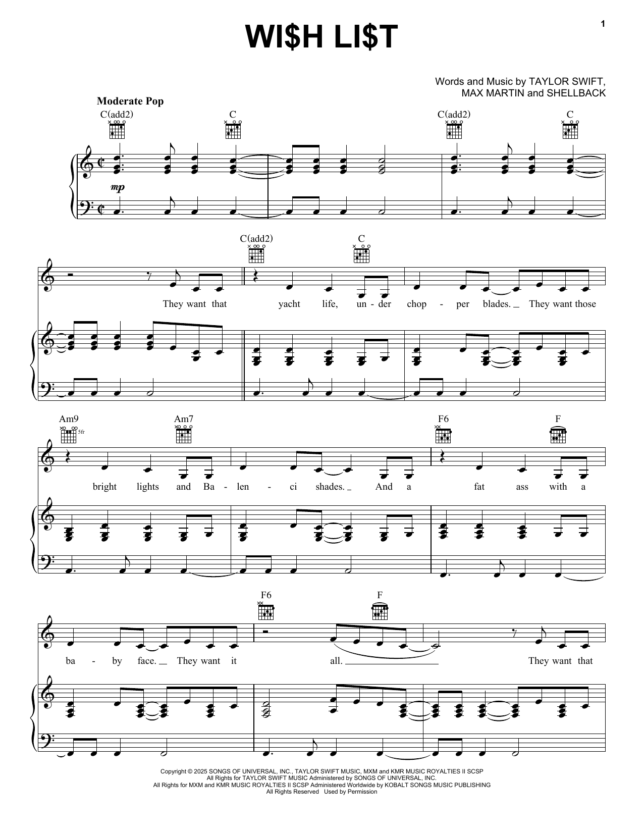 Download Taylor Swift Wi$h Li$t sheet music notes that was written for Easy Piano and includes 8 page(s). Printable Pop PDF score is easy to learn to play. Learn more about the conductor of the song and Easy Piano music notes score you can easily download and has been arranged for. The number (SKU) in the catalogue is Pop and code 1841070. The EPF Taylor Swift sheet music Minimum required purchase quantity for the music notes is 1. Please check if transposition is possible before your complete your purchase. - Reviews